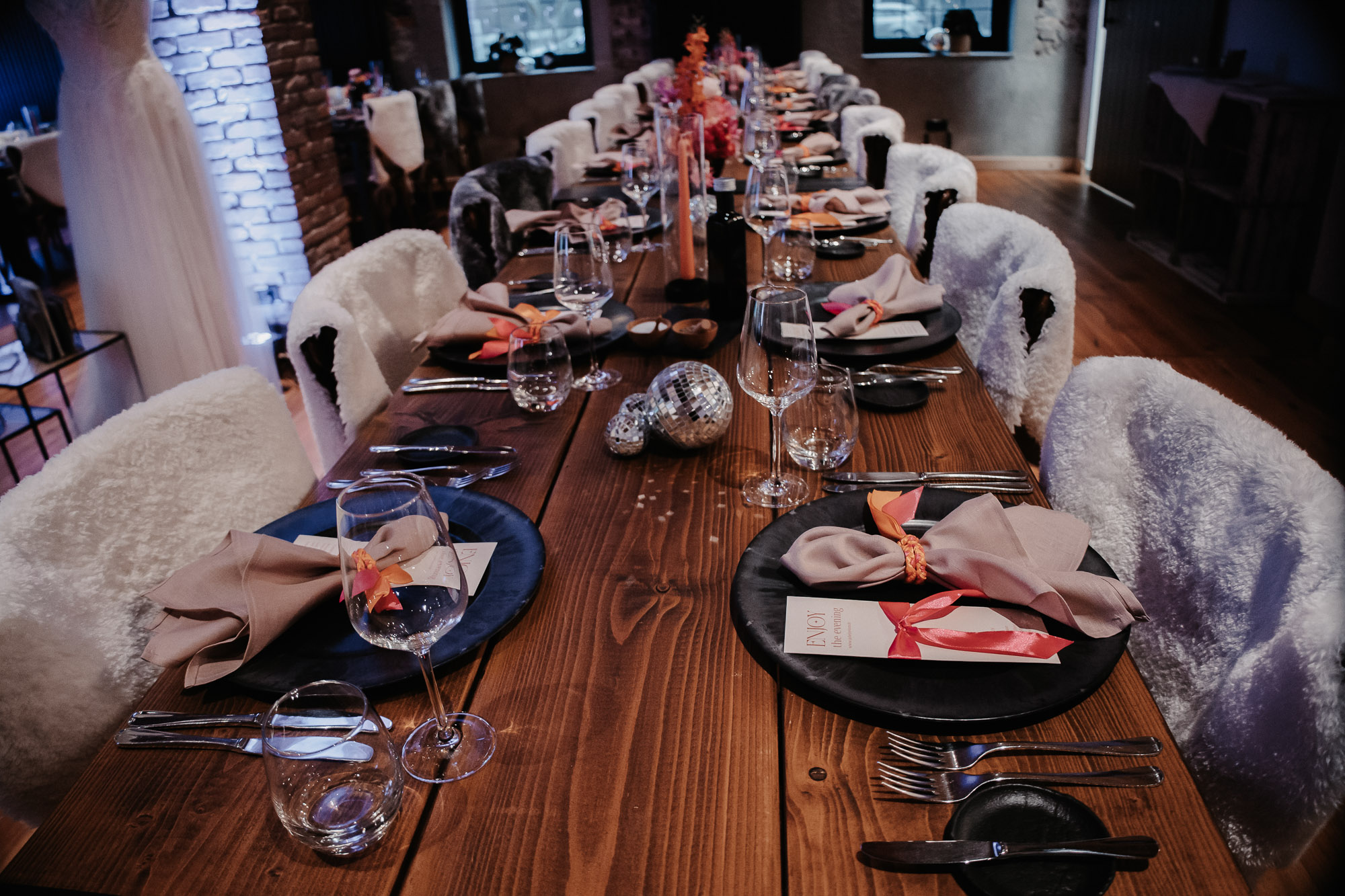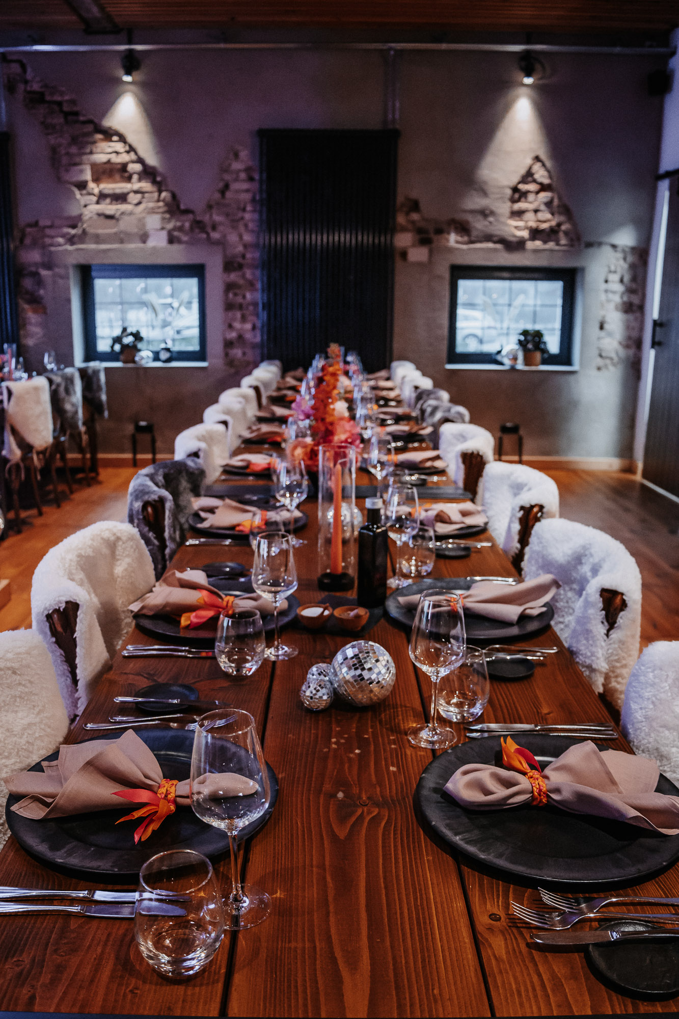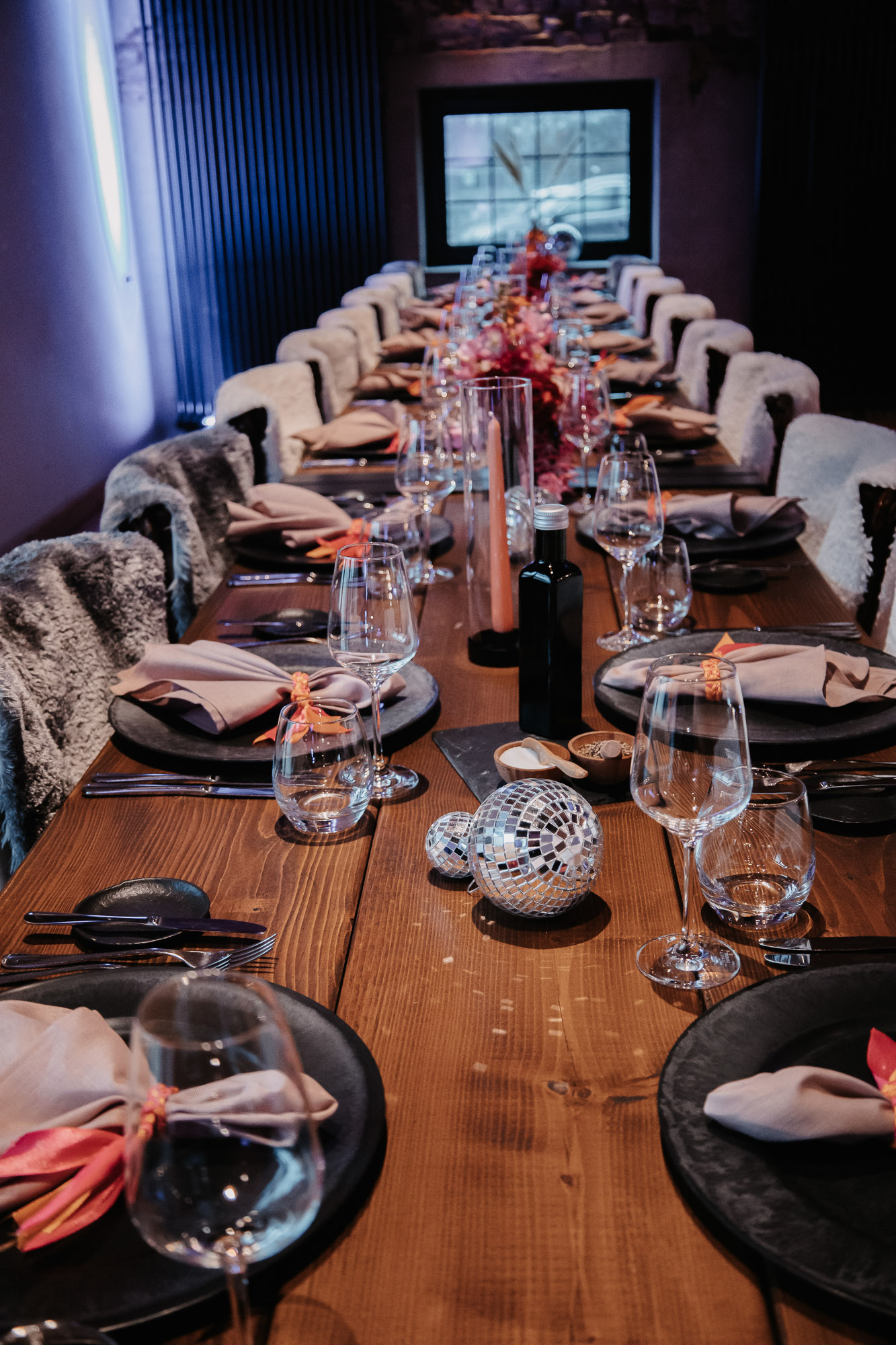 Harmonie zwischen Deko und Location: Die rustikalen Holztische mit schwarzen Details bildeten eine ideale Bühne für unser kräftiges Farbkonzept. Die Ambientebeleuchtung des Seesaals tauchten wir passend in Pink, um eine stimmige Atmosphäre zu schaffen. Kerzen in Orange, gehalten von schwarzen Kerzenhaltern, rundeten das Gesamtbild ab, das stilvoll, nicht zu überladen und dennoch passend zum rustikalen Charme des Seesaals war.