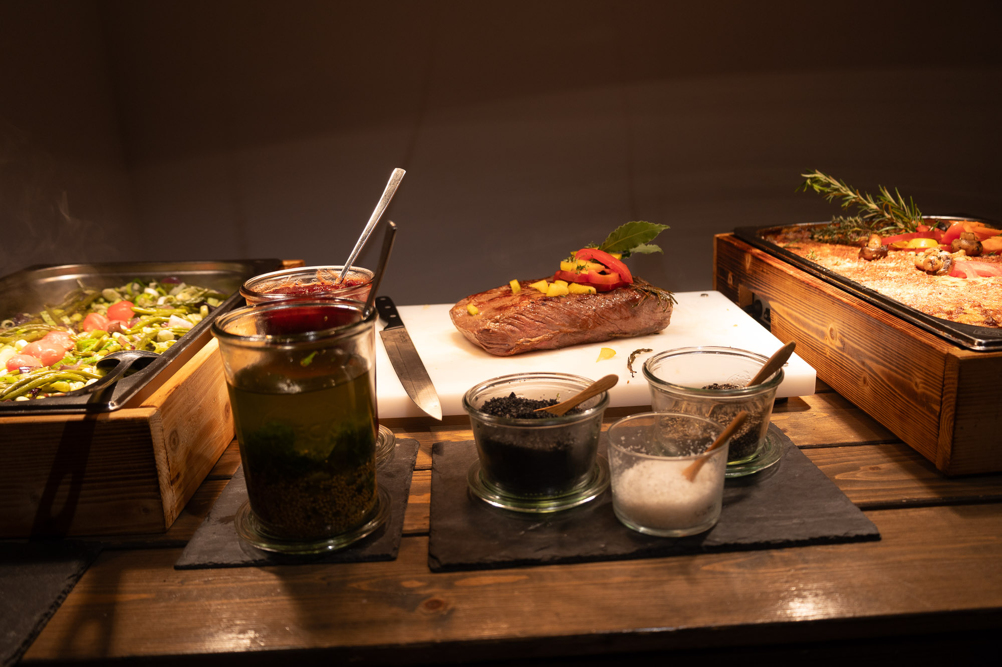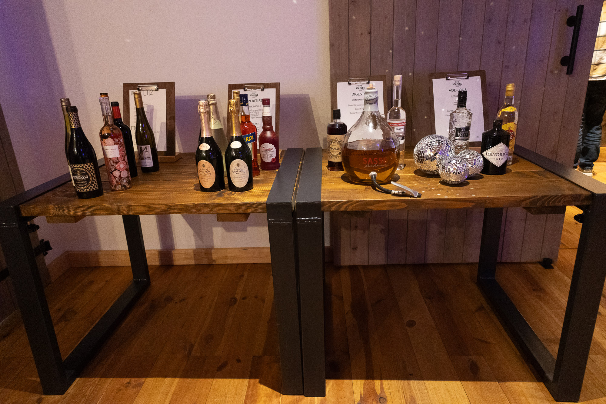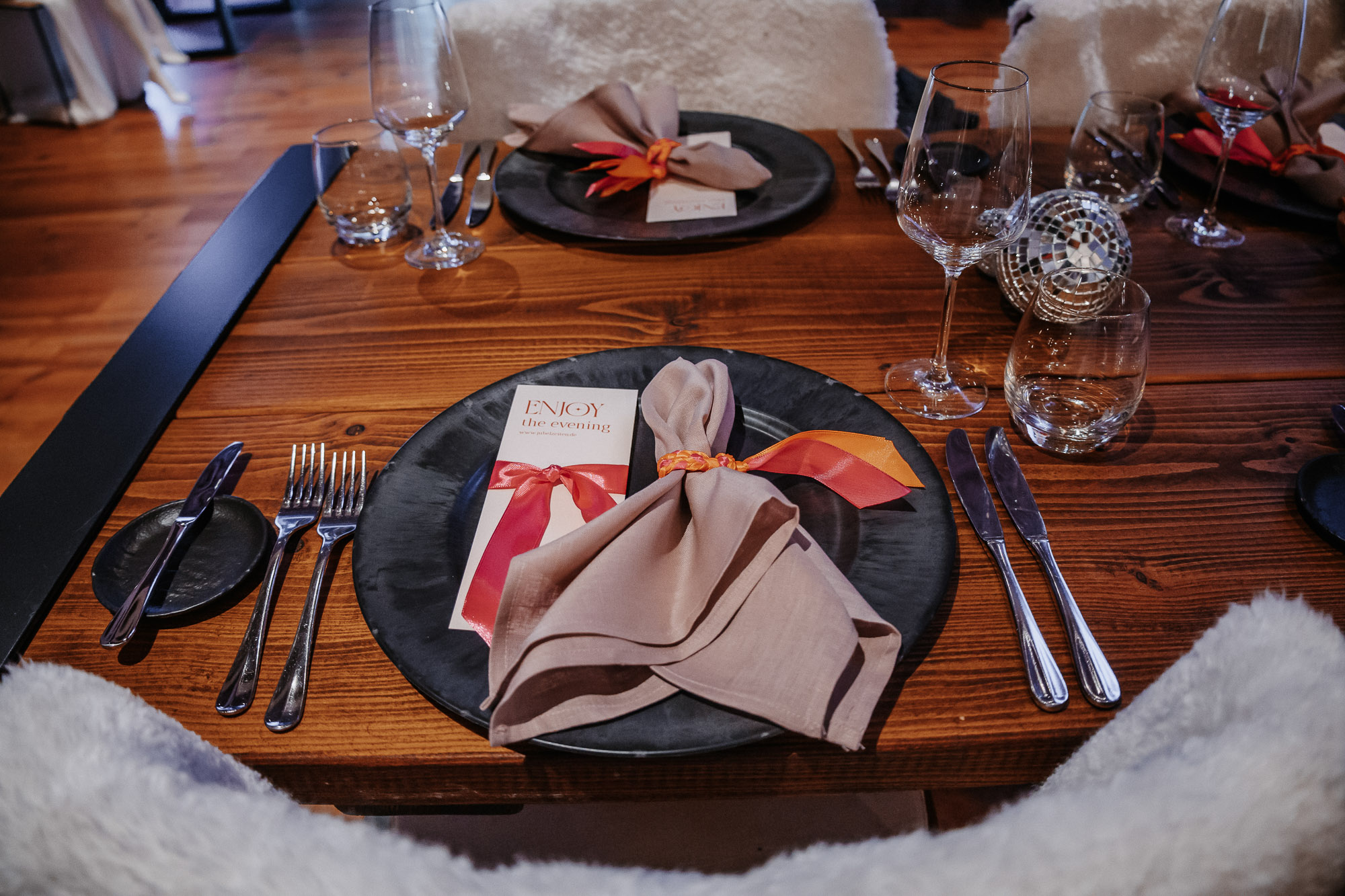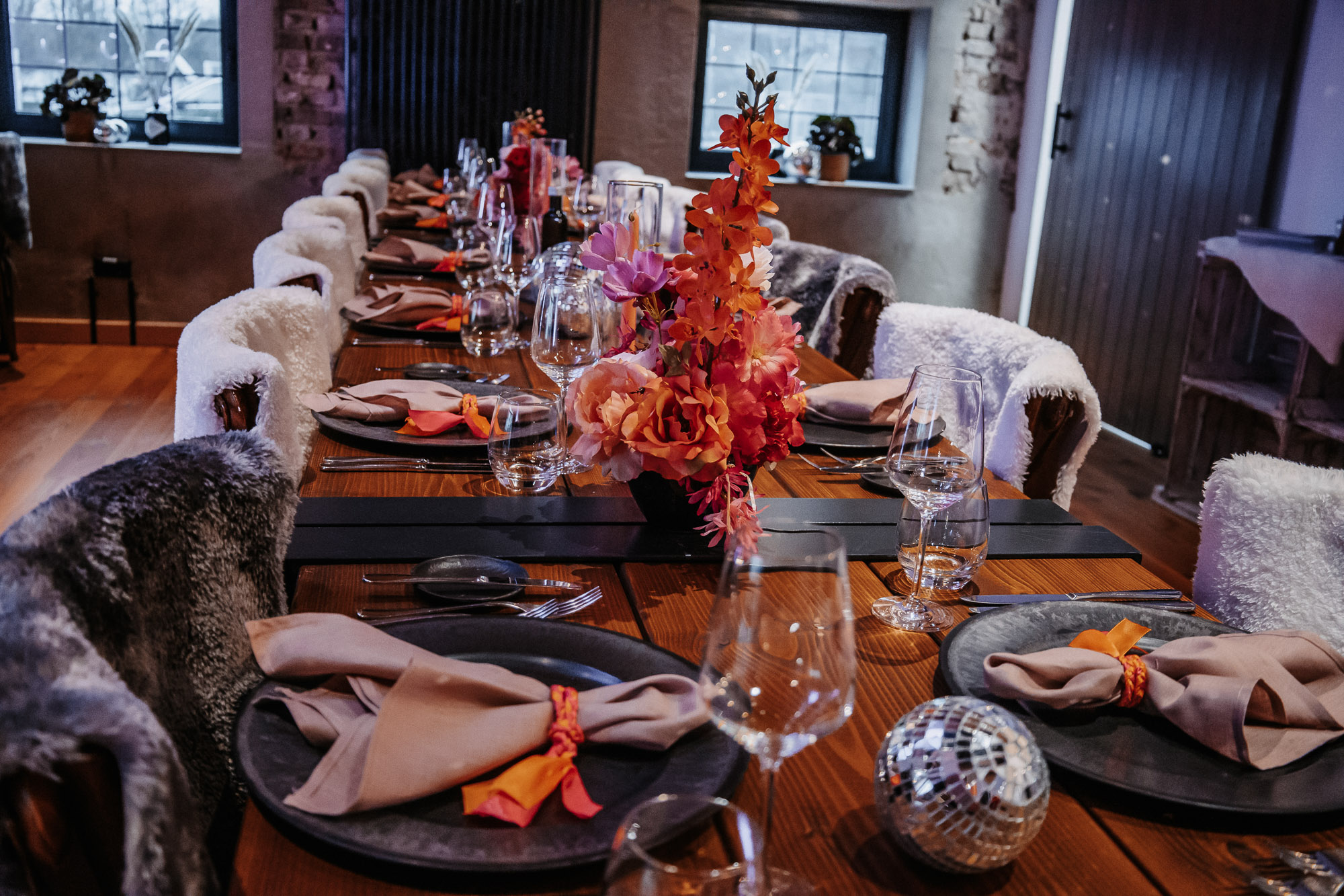 Harmonie zwischen Deko und Location: Die rustikalen Holztische mit schwarzen Details bildeten eine ideale Bühne für unser kräftiges Farbkonzept. Die Ambientebeleuchtung des Seesaals tauchten wir passend in Pink, um eine stimmige Atmosphäre zu schaffen. Kerzen in Orange, gehalten von schwarzen Kerzenhaltern, rundeten das Gesamtbild ab, das stilvoll, nicht zu überladen und dennoch passend zum rustikalen Charme des Seesaals war.