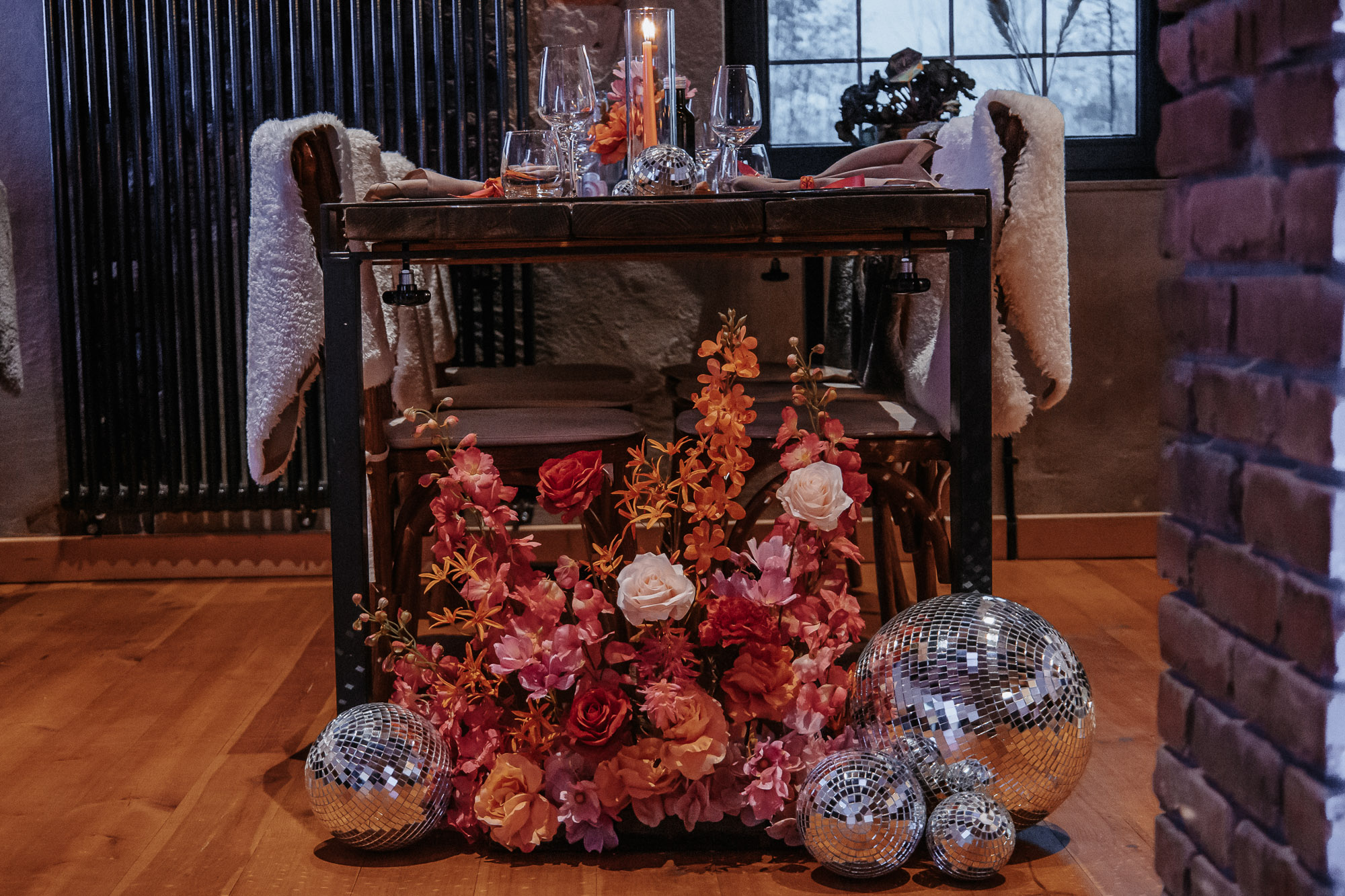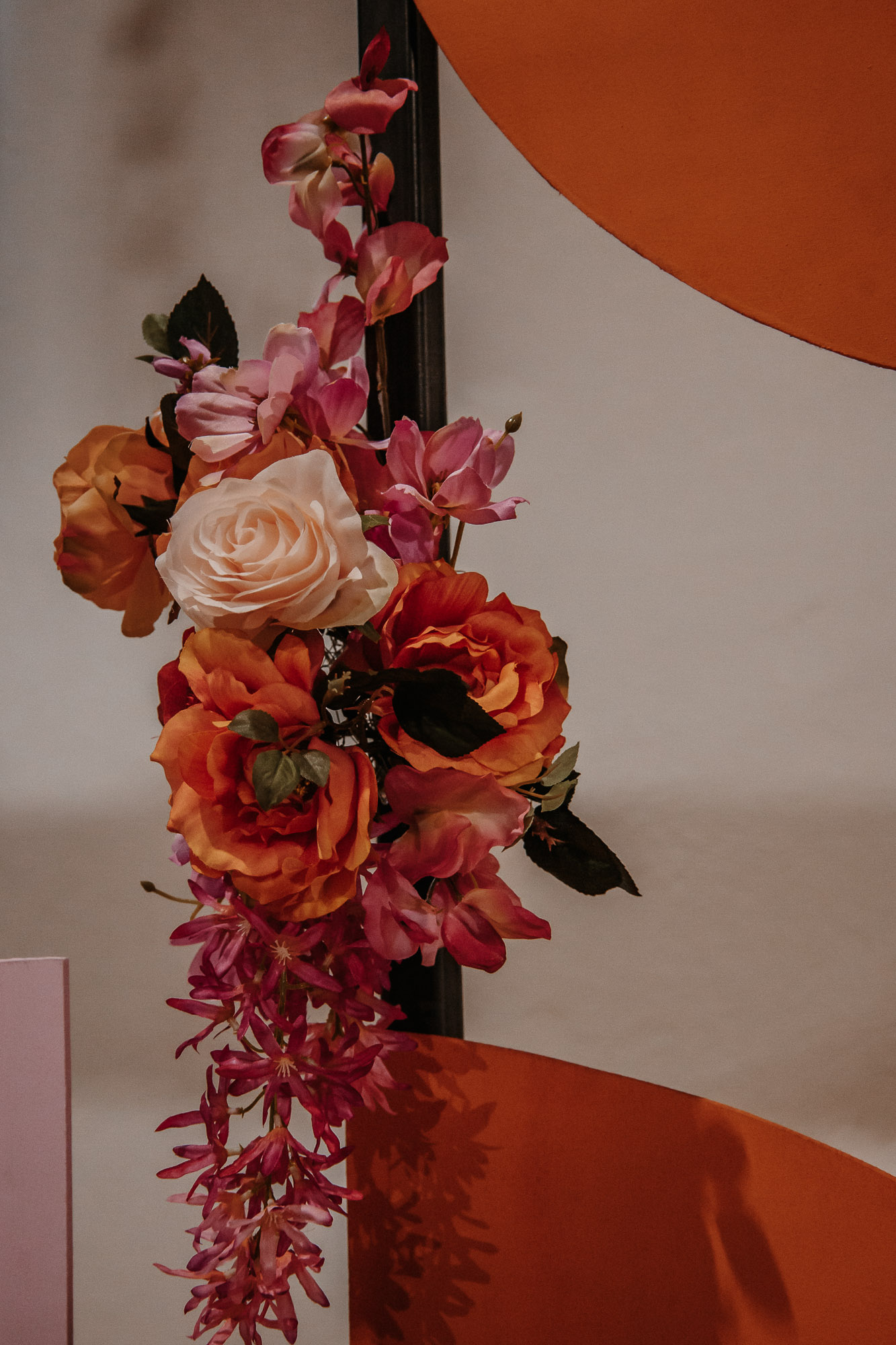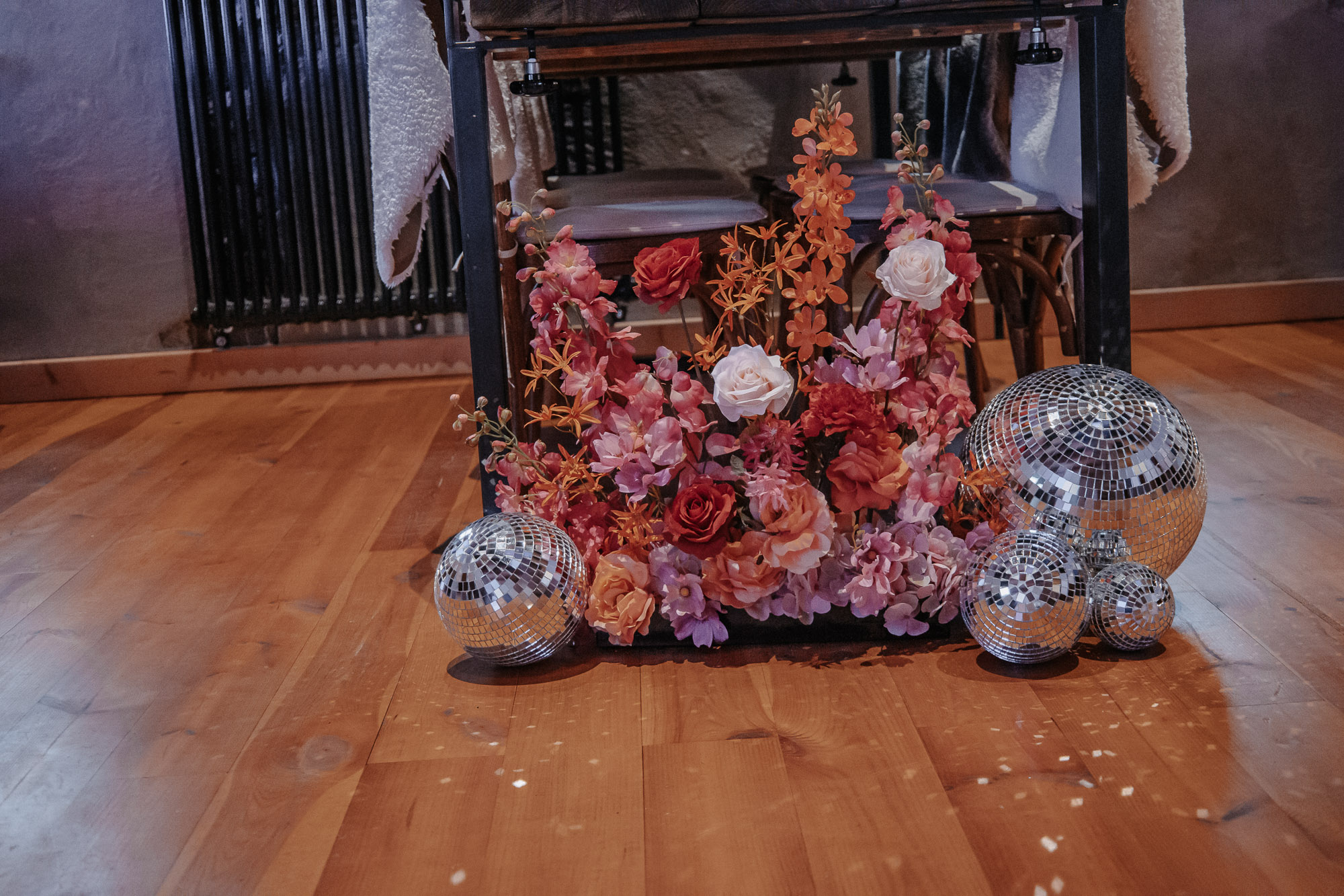 Ein farbenfrohes Konzept der 70er-Jahre-Disco-Ära: Inspiriert von den lebhaften Farben und der Energie dieser Ära, haben wir uns für knallig bunte Pink- und Orangetöne entschieden. Unsere Blumen verzichteten bewusst auf Grün und erstrahlten stattdessen in leuchtenden Farben, die sofort ins Auge sprangen.