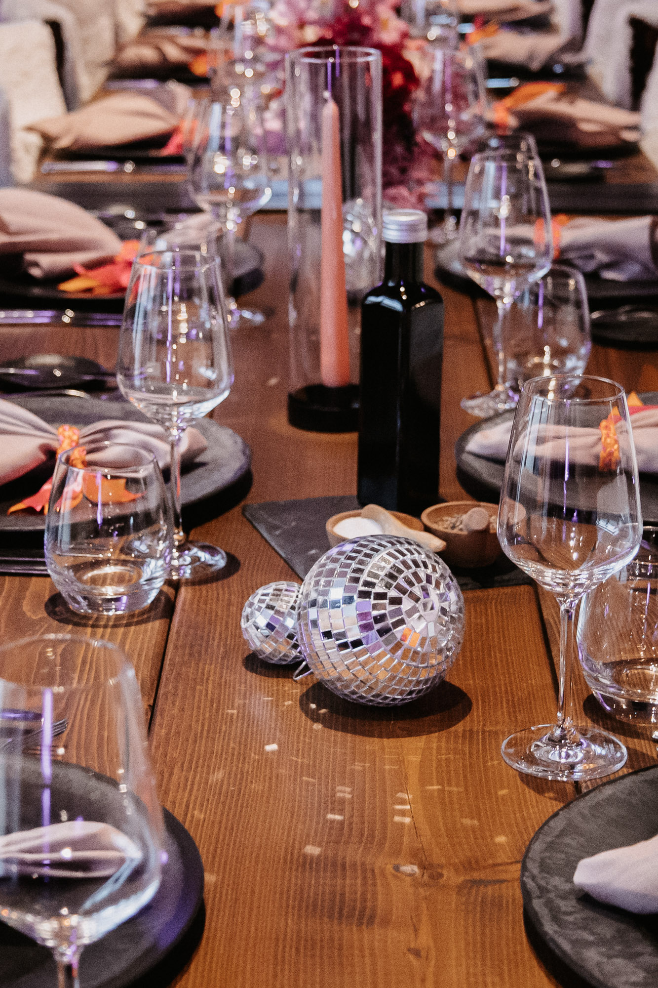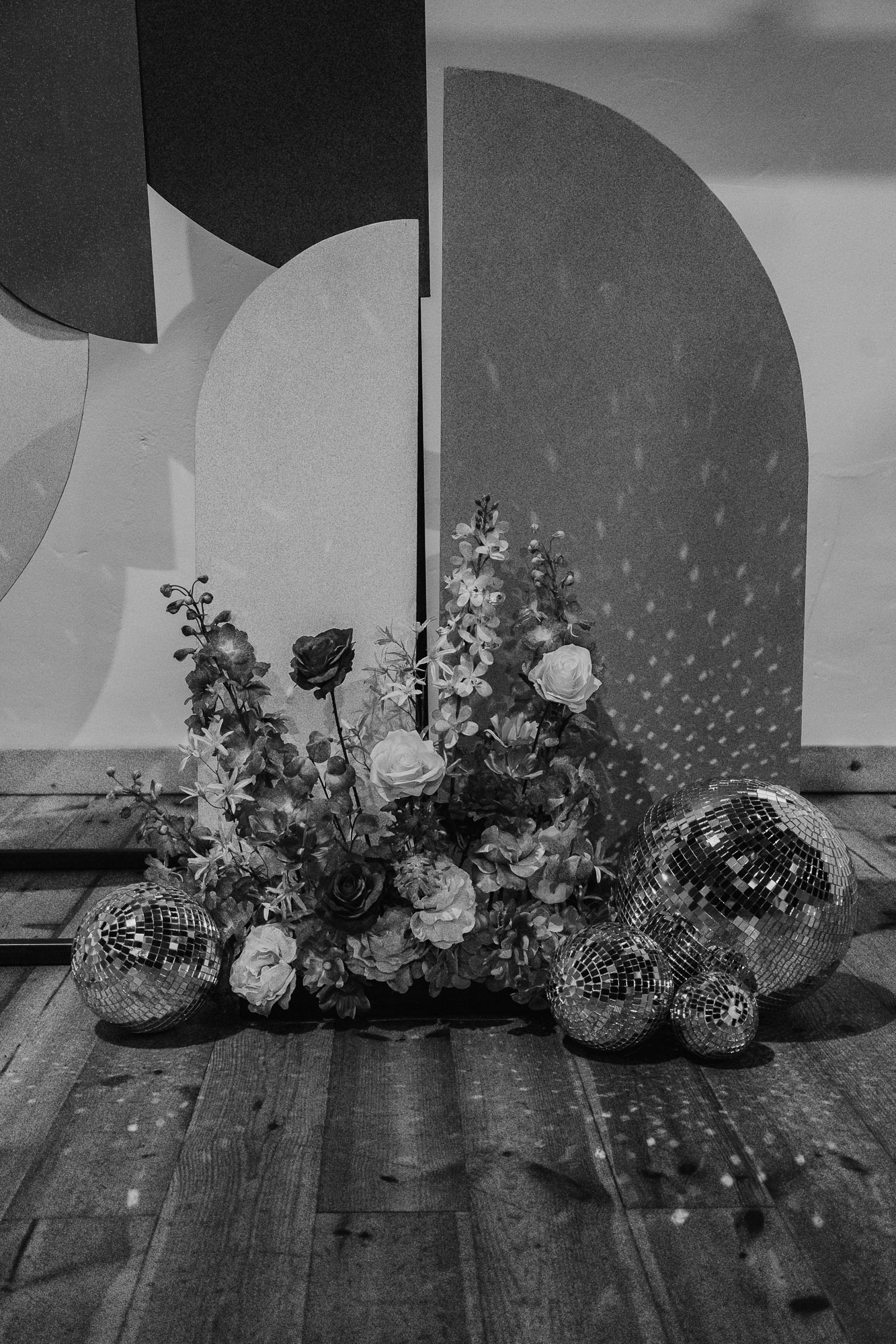Ein Fest für die Sinne: Besonders geliebt, haben wir die Spiegelkugeln, die wir auf den Tischen und im Raum verteilten. Sie fingen das Licht ein und warfen funkelnde Reflexionen auf Böden, Wände und Decken, wodurch eine mitreißende Atmosphäre entstand. Ein weiteres Highlight war der Traubogen mit geometrischen Formen, der das gesamte Konzept perfekt aufgriff.