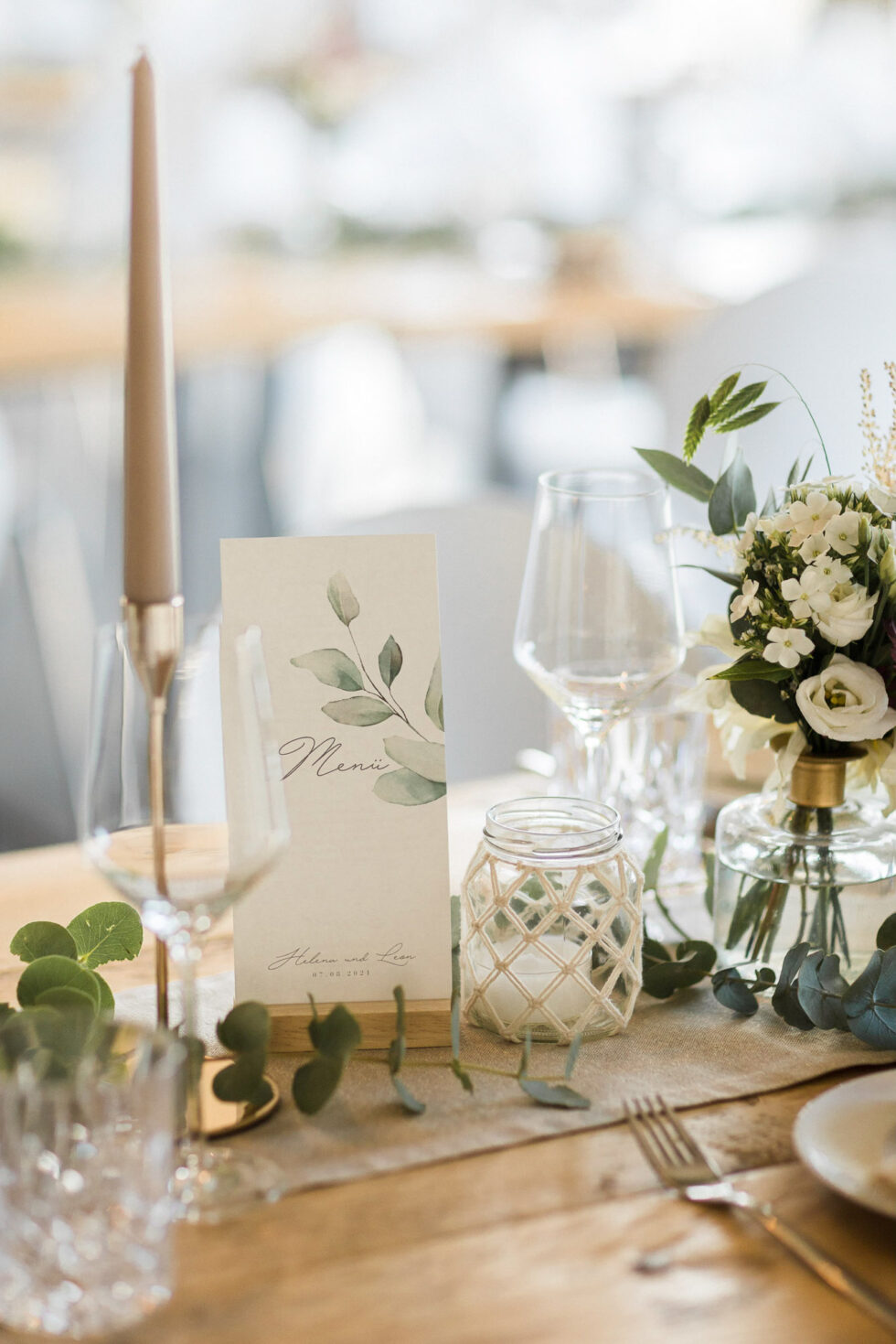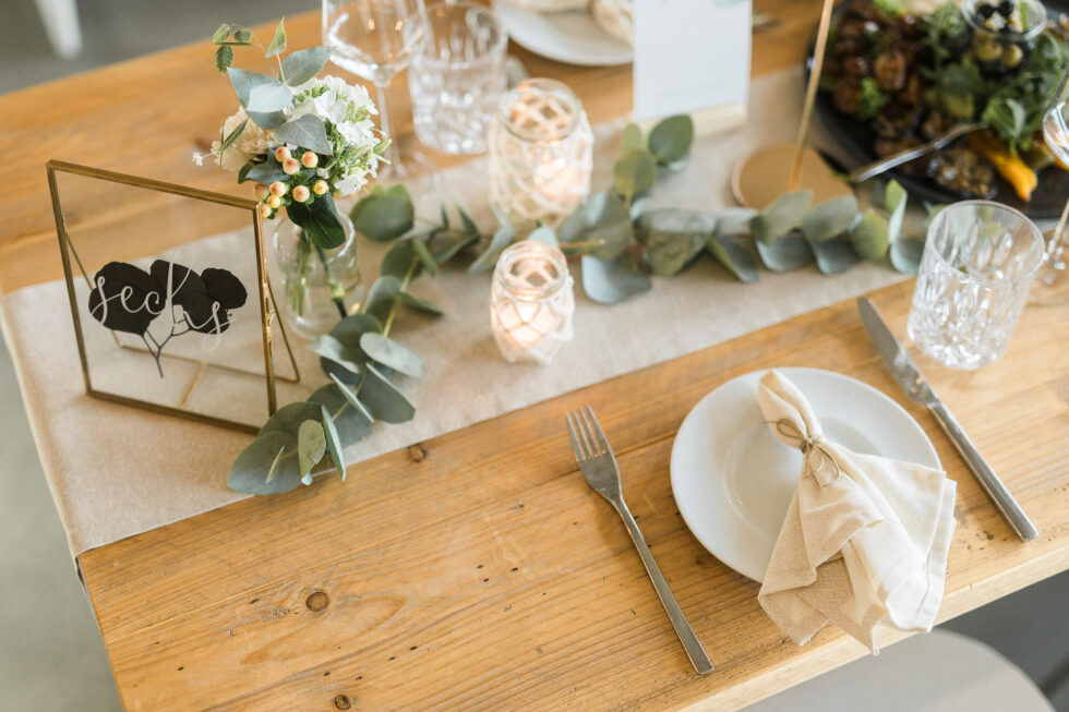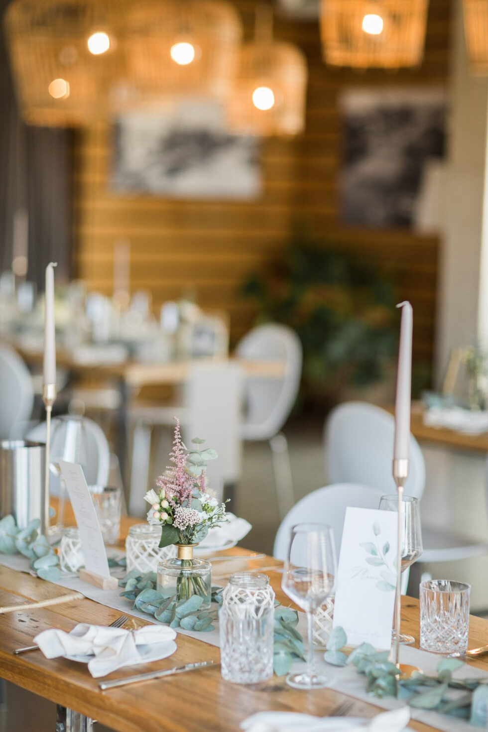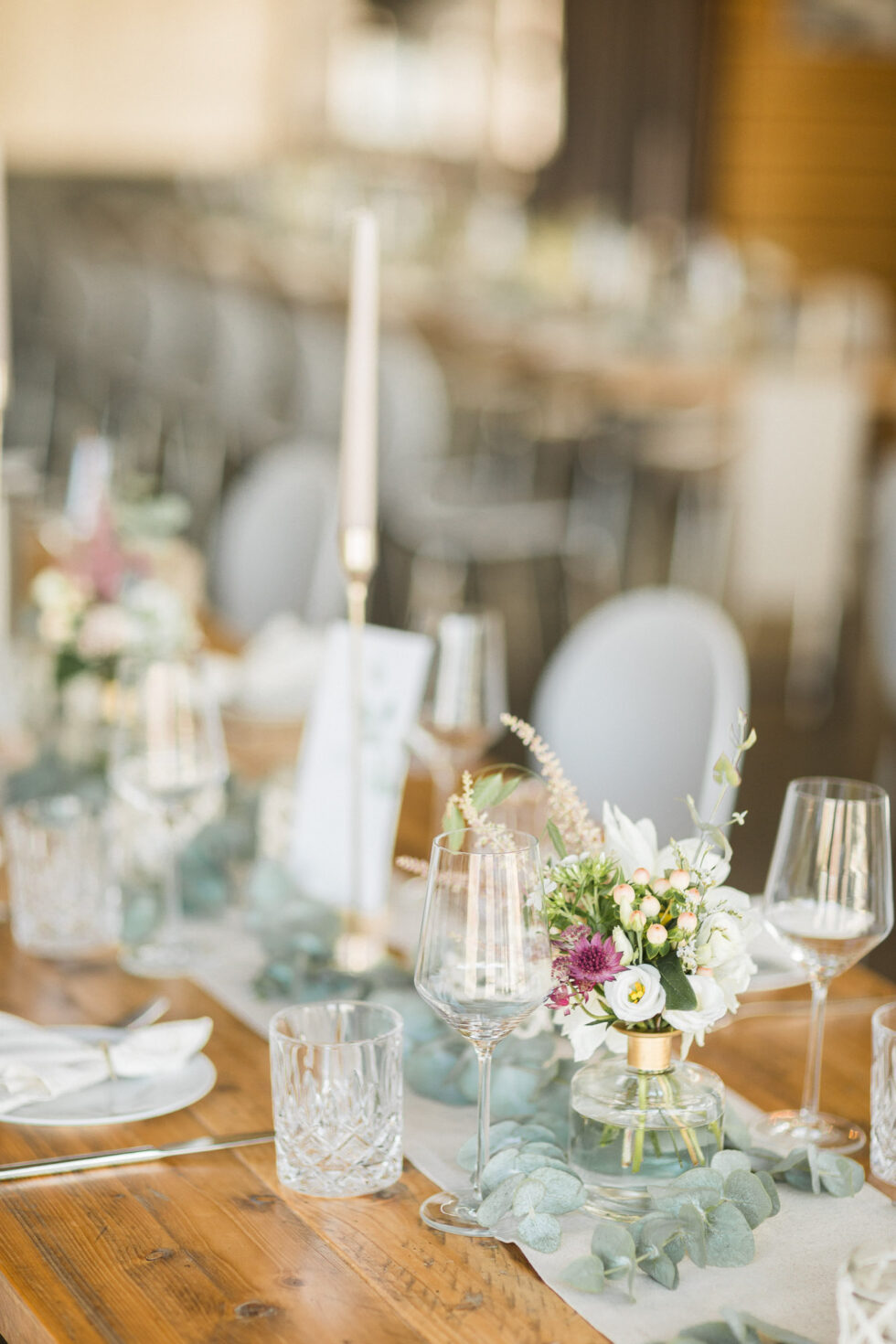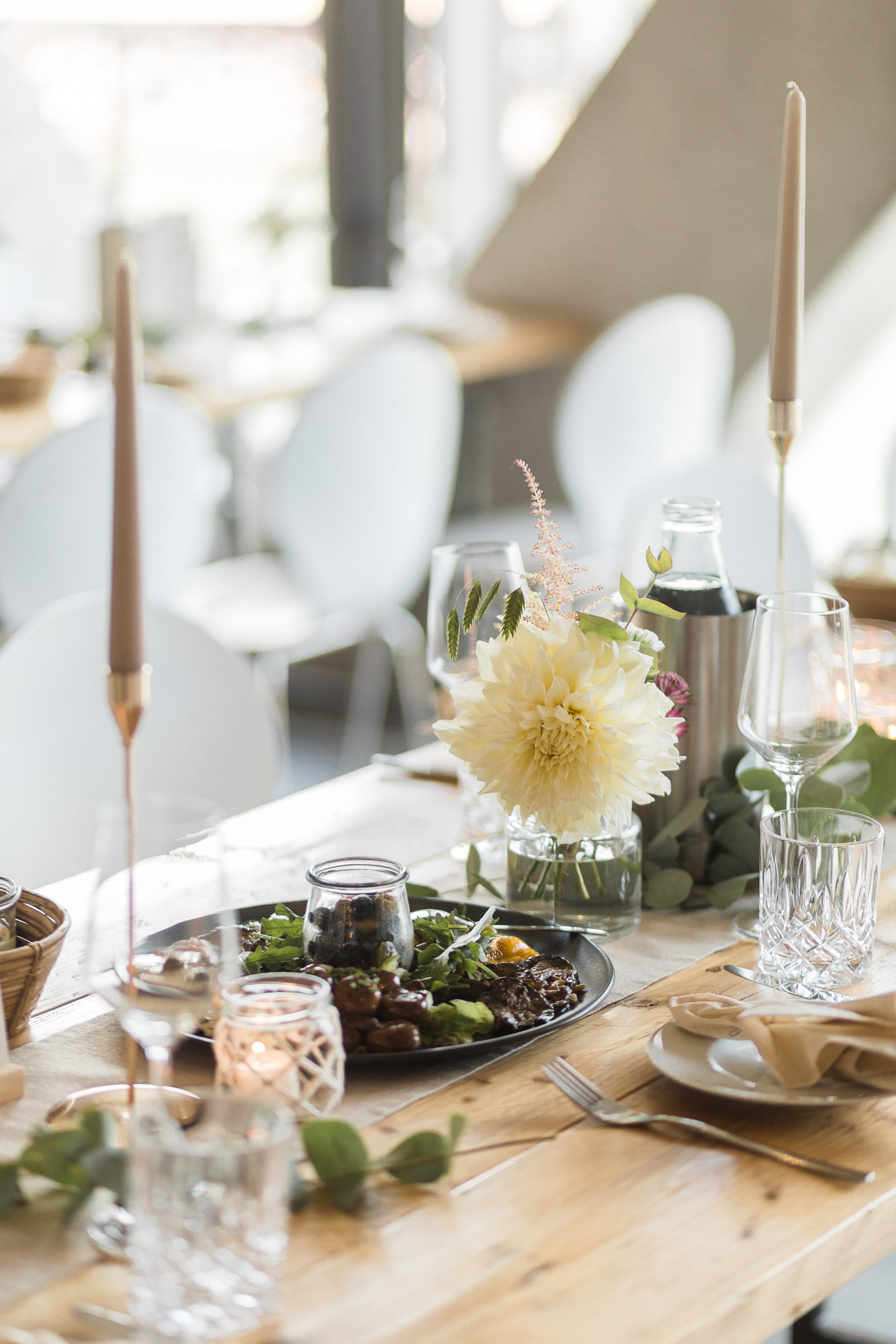 Die Dekoration bestach durch Natürlichkeit. Eukalyptuszweige zierten die Tische und schufen eine frische, luftige Atmosphäre. Helle Blumen, die in zarten Farben mit vereinzelten Farbtupfern in einem kräftigen Magentaton um die Wette strahlten, griffen den Look des Festsaals super auf. Unsere Kerzenhalter Konny in Gold sorgten für einen Hauch von Eleganz ohne Aufdringlich zu wirken.