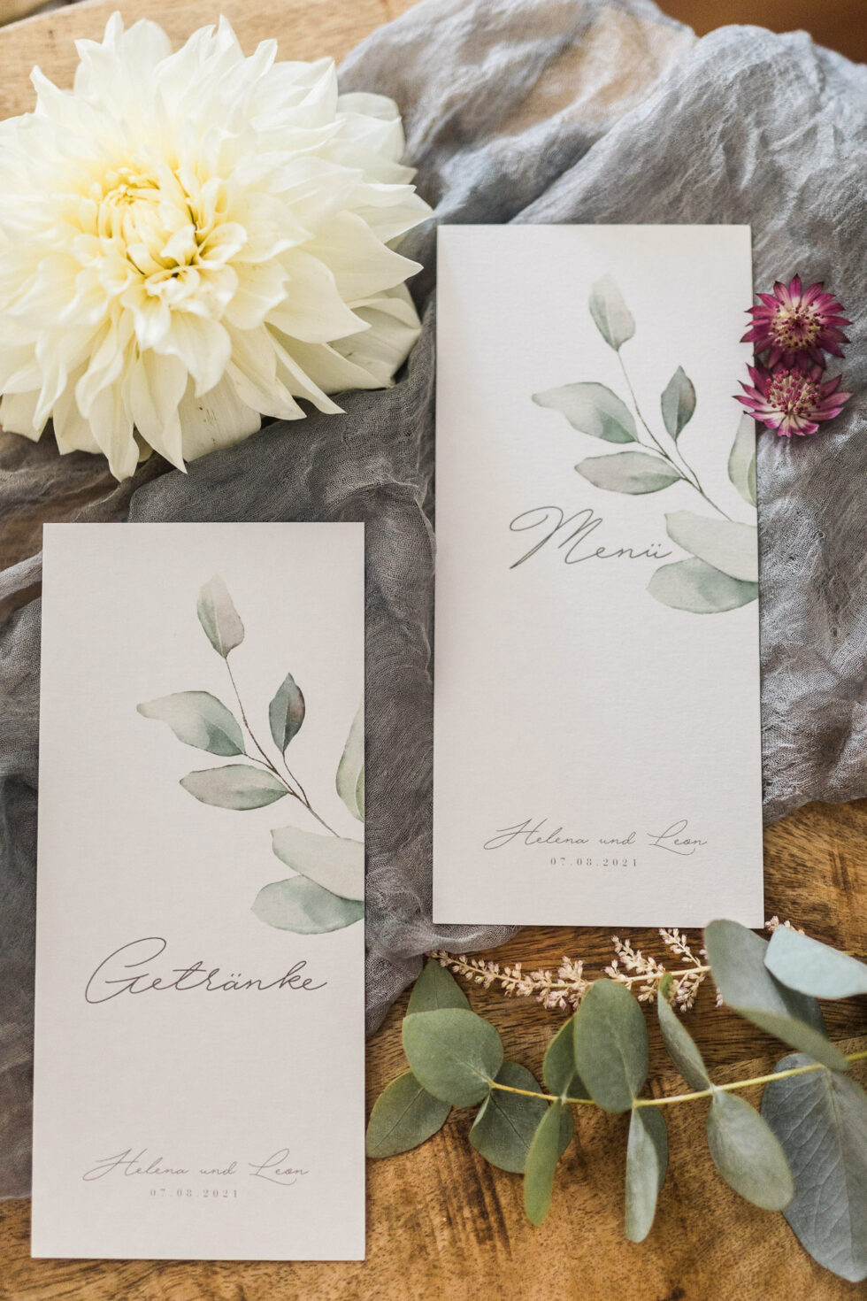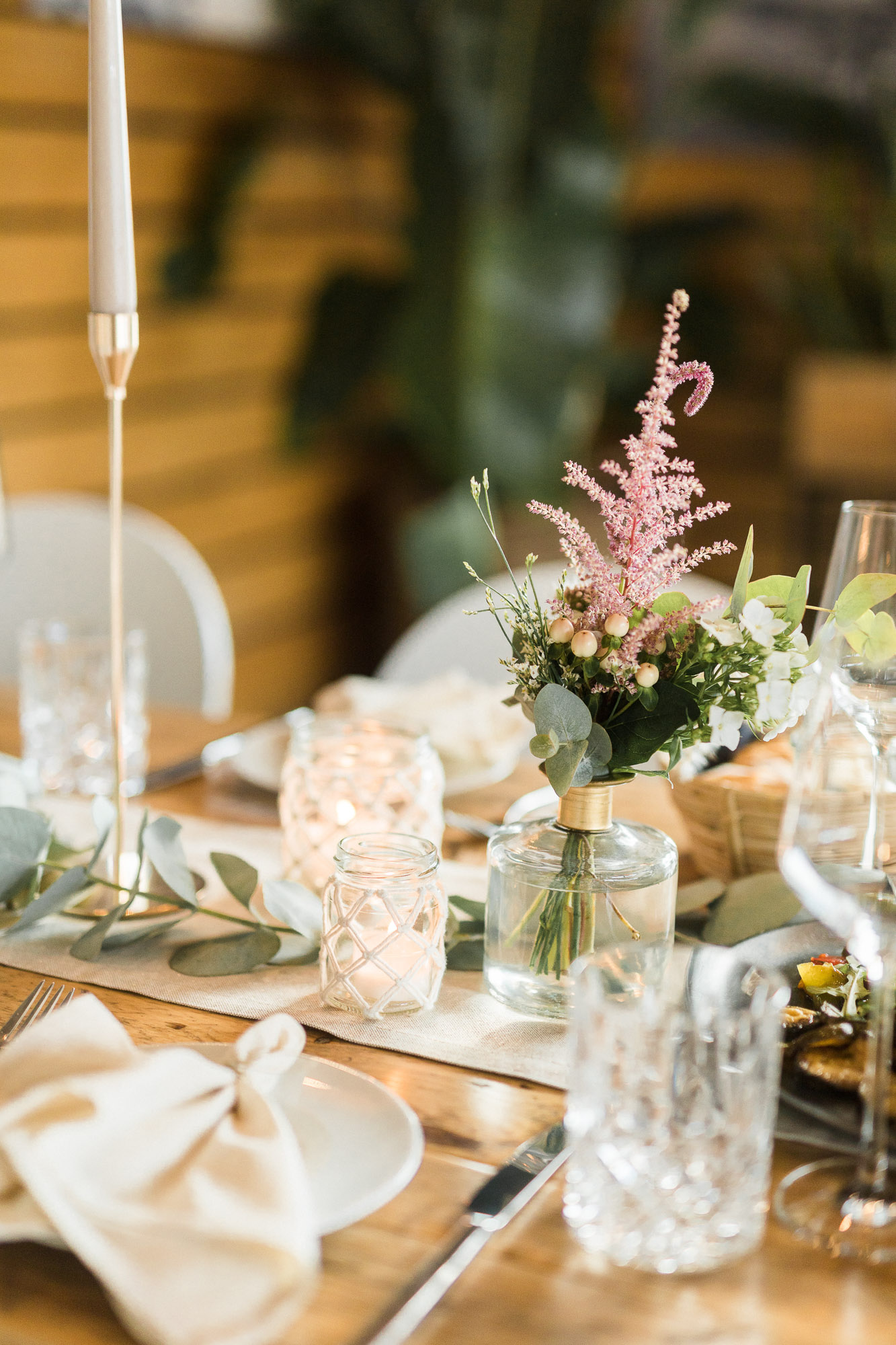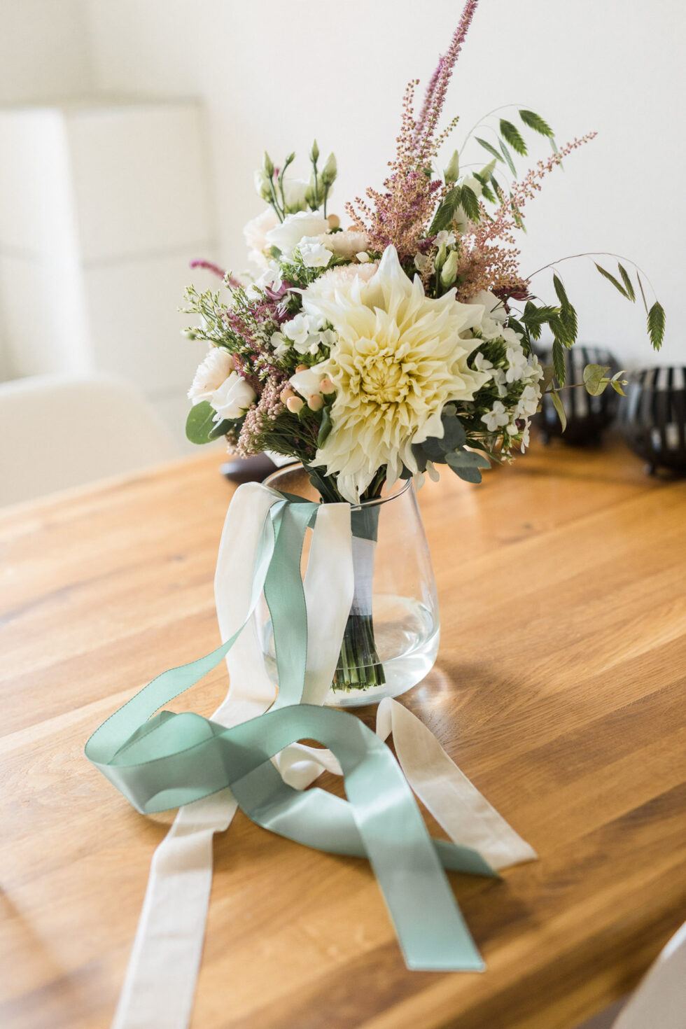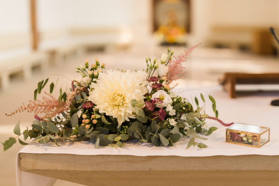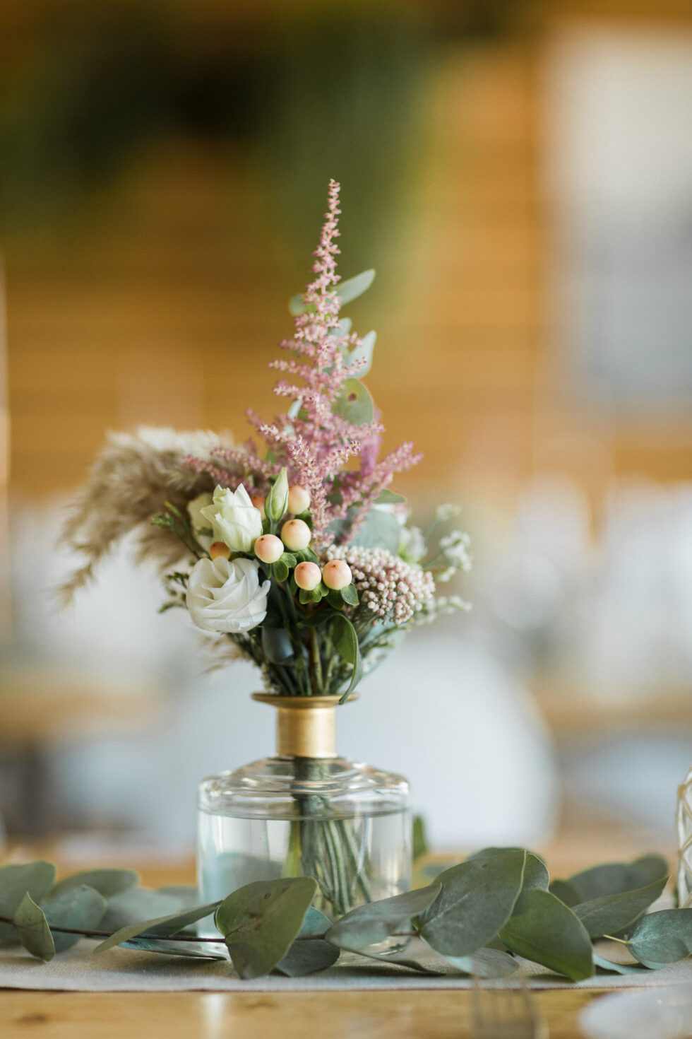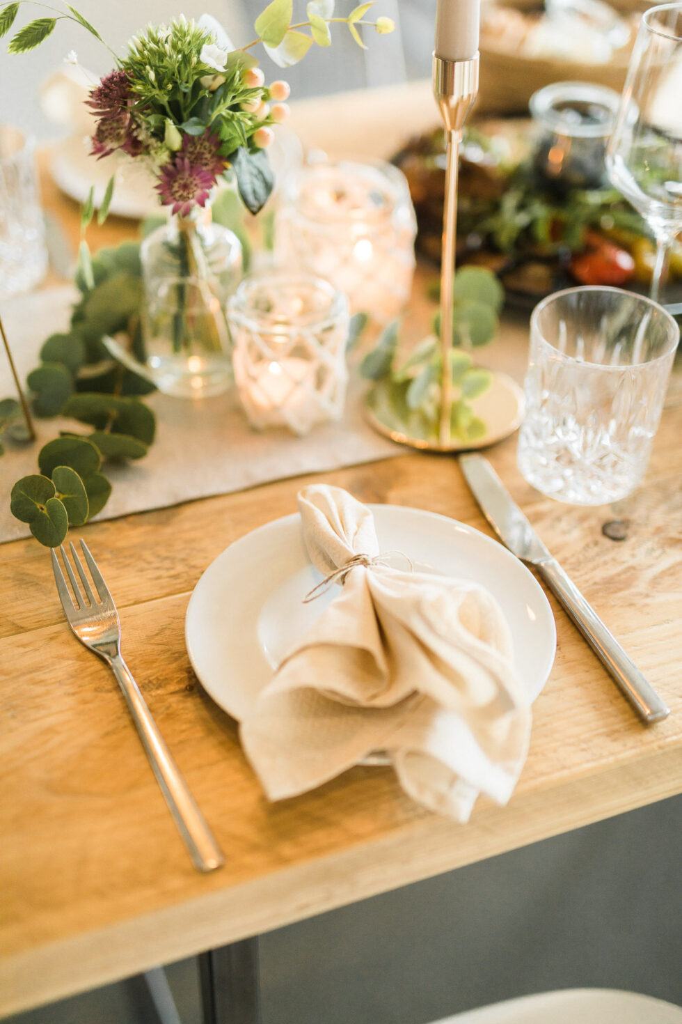 Die Dekoration bestach durch Natürlichkeit. Eukalyptuszweige zierten die Tische und schufen eine frische, luftige Atmosphäre. Helle Blumen, die in zarten Farben mit vereinzelten Farbtupfern in einem kräftigen Magentaton um die Wette strahlten, griffen den Look des Festsaals super auf. Unsere Kerzenhalter Konny in Gold sorgten für einen Hauch von Eleganz ohne Aufdringlich zu wirken.