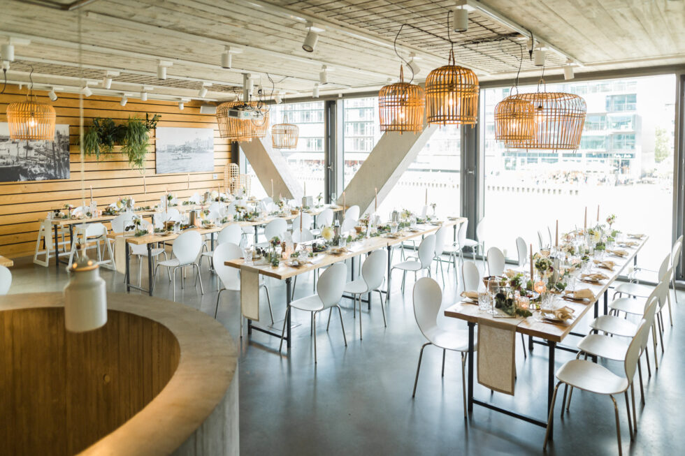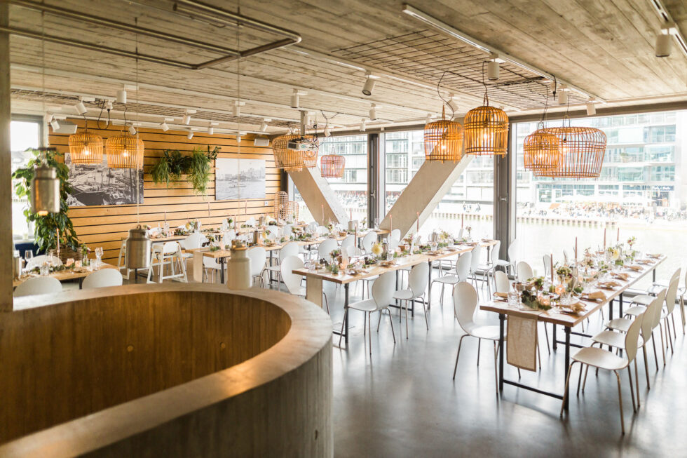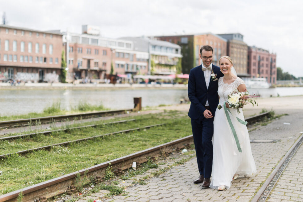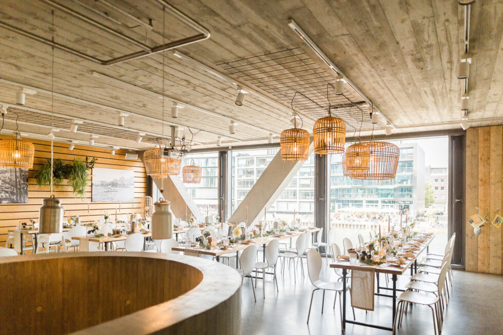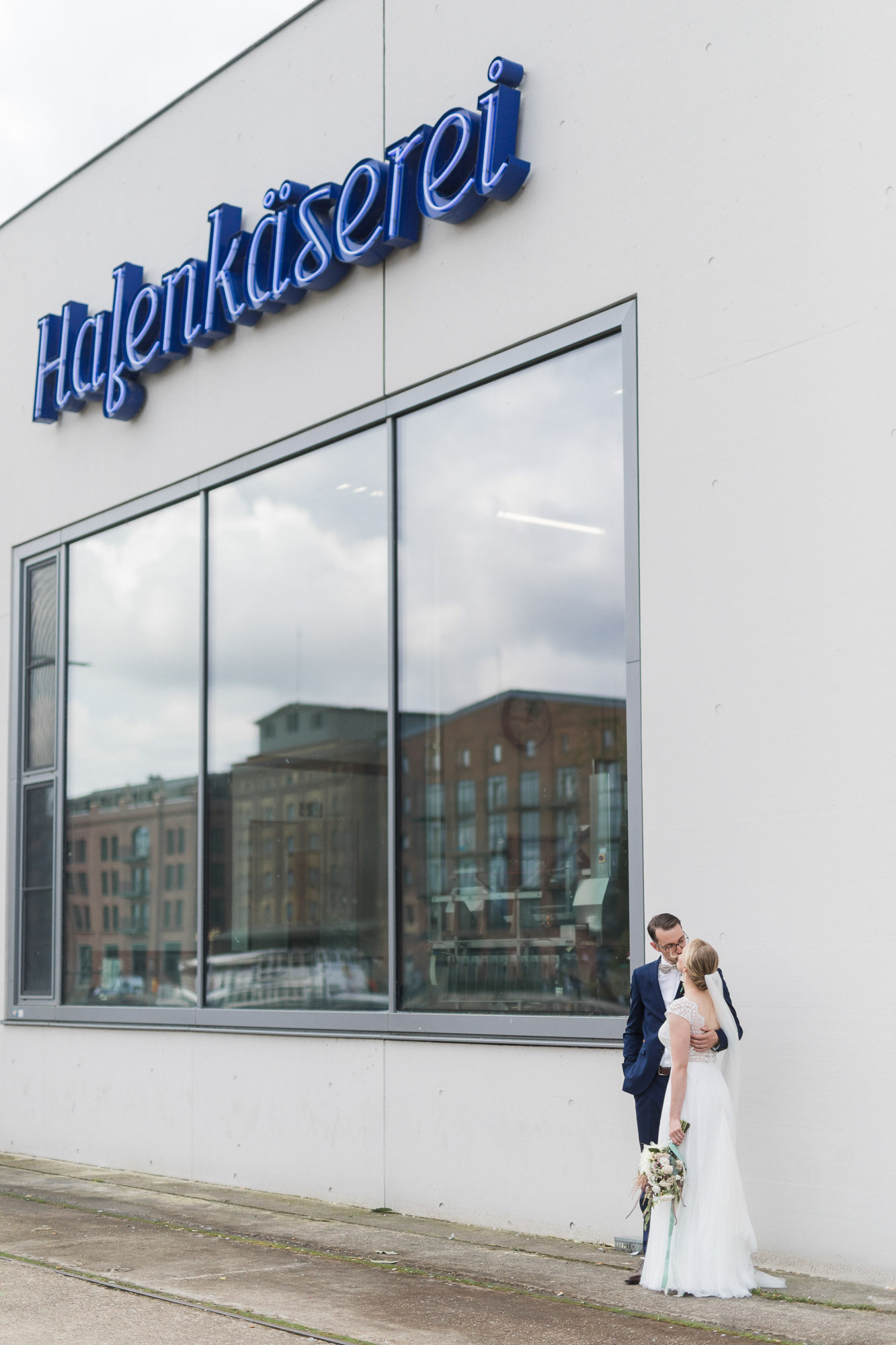 Was macht eine Hochzeit wirklich unvergesslich? Natürlich der Ort! Und wenn es einen Ort gibt, der urbanen Charme und industrielle Atmosphäre perfekt vereint, dann ist es die Hafenkäserei in Münster. Die rohen Betonwänder, die großen Fenster und lässigen Boho-Elemente schaffen eine Kulisse, die einzigartig ist – der Blick auf den Hafen von Münster tut ihr übriges.