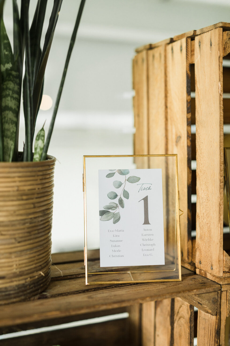 Ein weiteres Highlight dieser Hochzeit für mich war die kreative Umsetzung des Sitzplans. Unsere Bilderrahmen Bella waren mit der Papeterie des Hochzeitspaares gefüllt. Und sie fanden ihren perfekten Platz im hauseigenen Kistenregal der Hafenkäserei, das die verschiedenen Käsesorten ausstellt. So konnten wir die Deko der Hochzeit und die Deko der Location verbinden.