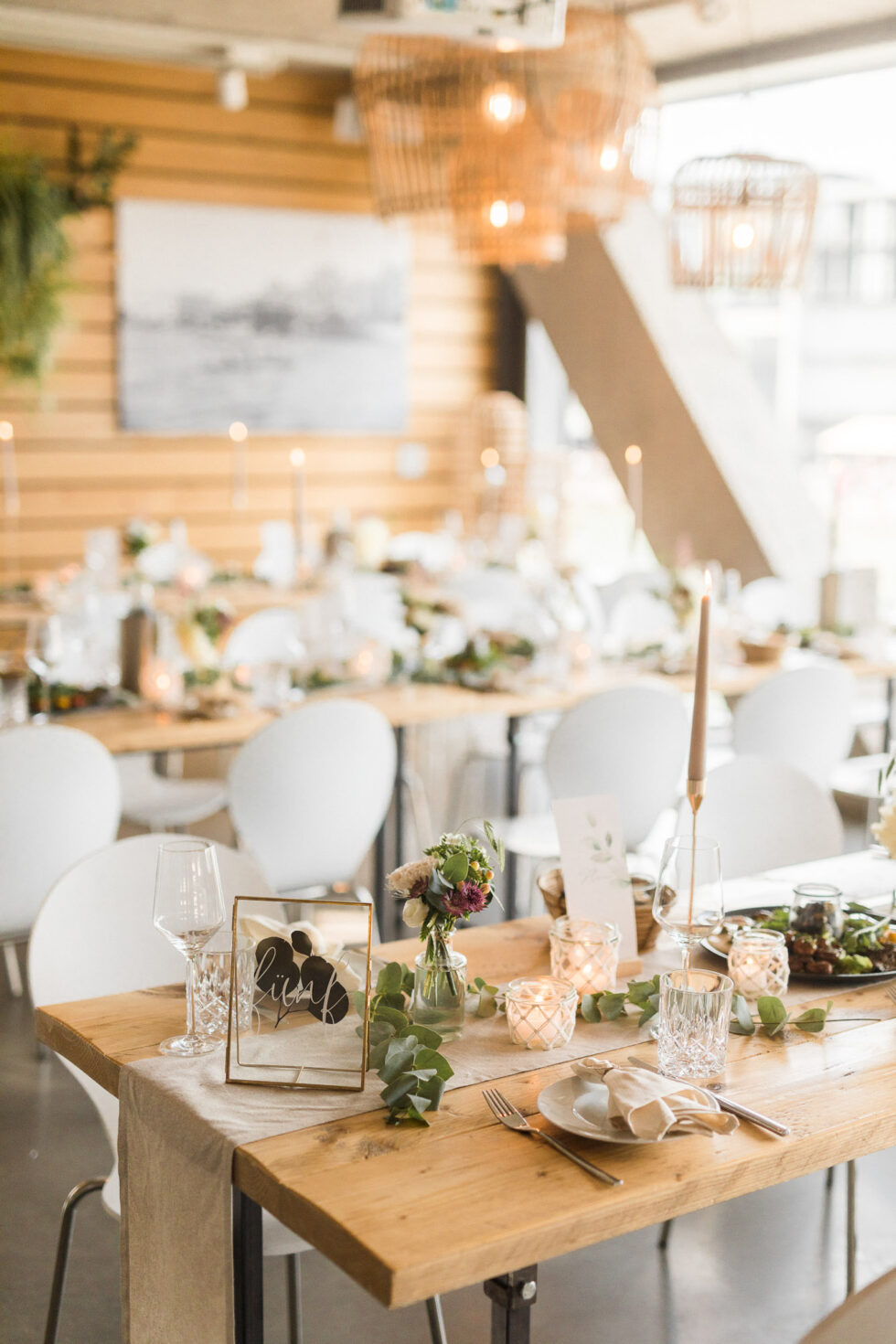 Ein lichtdurchfluteter Festsaal mit stylischem Interieur, Blick auf die hauseigene Käseproduktion und direkt am Hafen von Münster – damit bietet die Hafenkäserei schon ein einmaliges Ambiente für eine Hochzeit. Dieses durften wir für Helena und Leon mit einer frischen, hellen Dekoration für ihre Hochzeit herrichten. Frischer Eukalyptus, die helle Blumenauswahl mit einem kräftigen Farbtupfer in Magenta sowie ausgewählte Gold und Makramee-Elemente machten die Dinnertafeln zu einem einladenden Ort für das Hochzeitspaar und die Gäste.