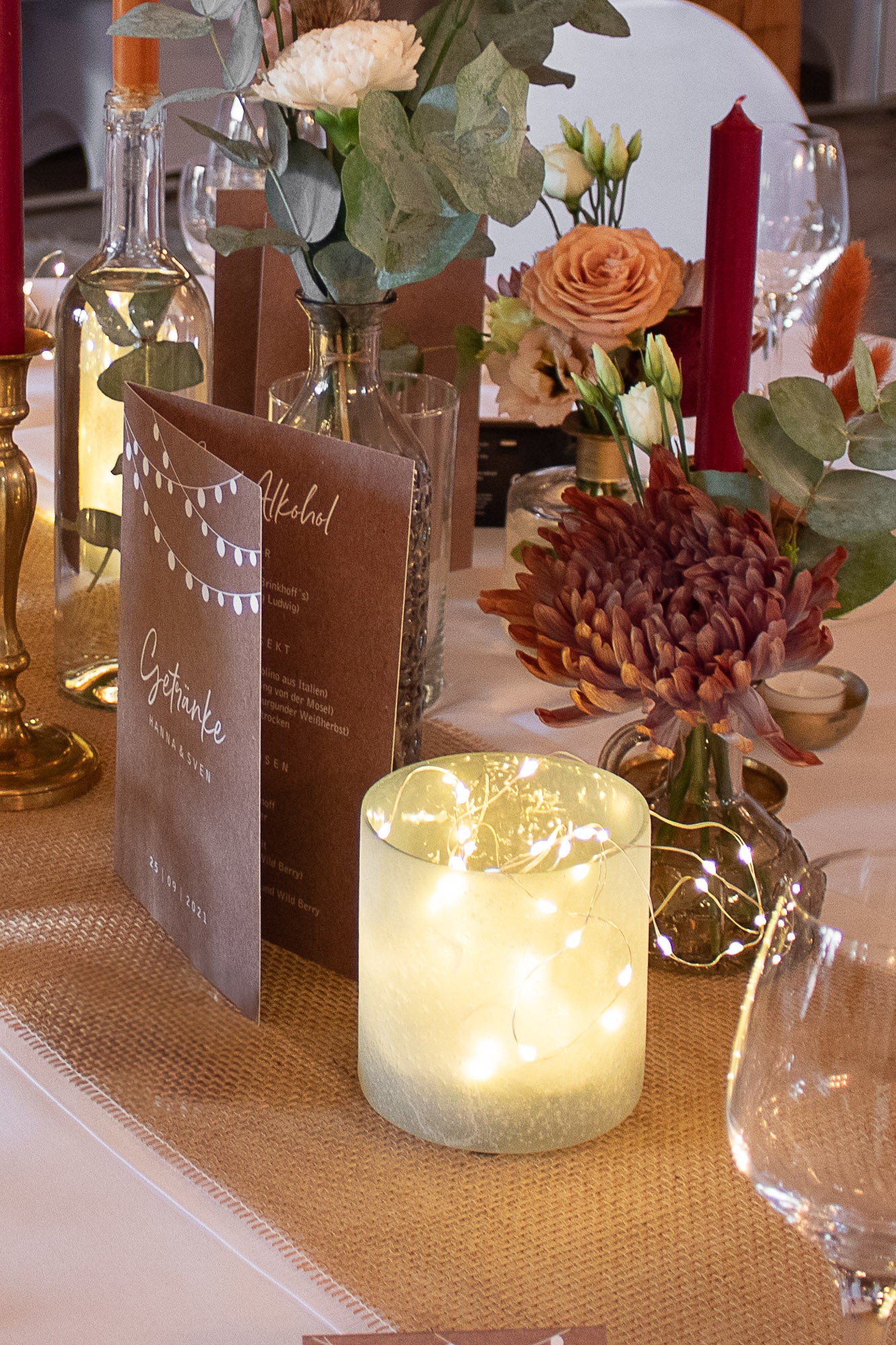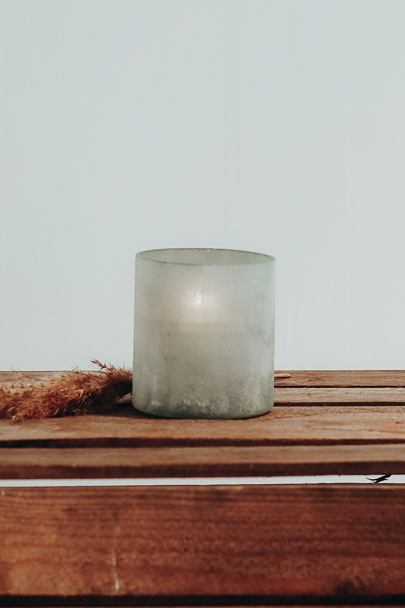 Tabea ist kein gewöhnliches Teelicht: Das großformatige Glas fällt durch seine besondere Haptik und Optik auf. Ein hellgrüner Grundton trifft auf eine raue, fast staubig-weiße Oberfläche – das ergibt einen Look, der zugleich natürlich und außergewöhnlich ist. Wie du auf den Fotos siehst, haben wir sowohl Kerzen als auch Lichterketten reingelegt und es sah beides super aus.