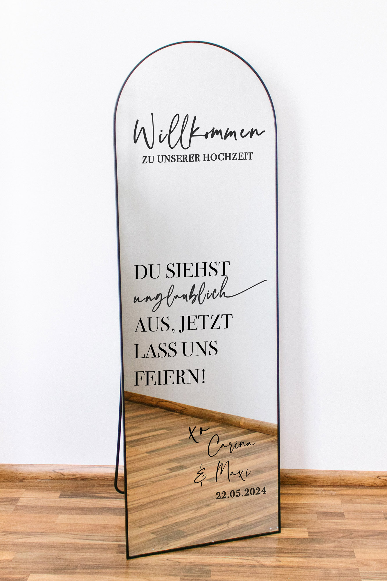Du möchtest statt Willkommen einen anderen Schriftzug, z. B. für einen Sitzplan oder einen Selfie-Spiegel? Melde dich gern, wir passen den Text oder auch die Schrift individuell an.