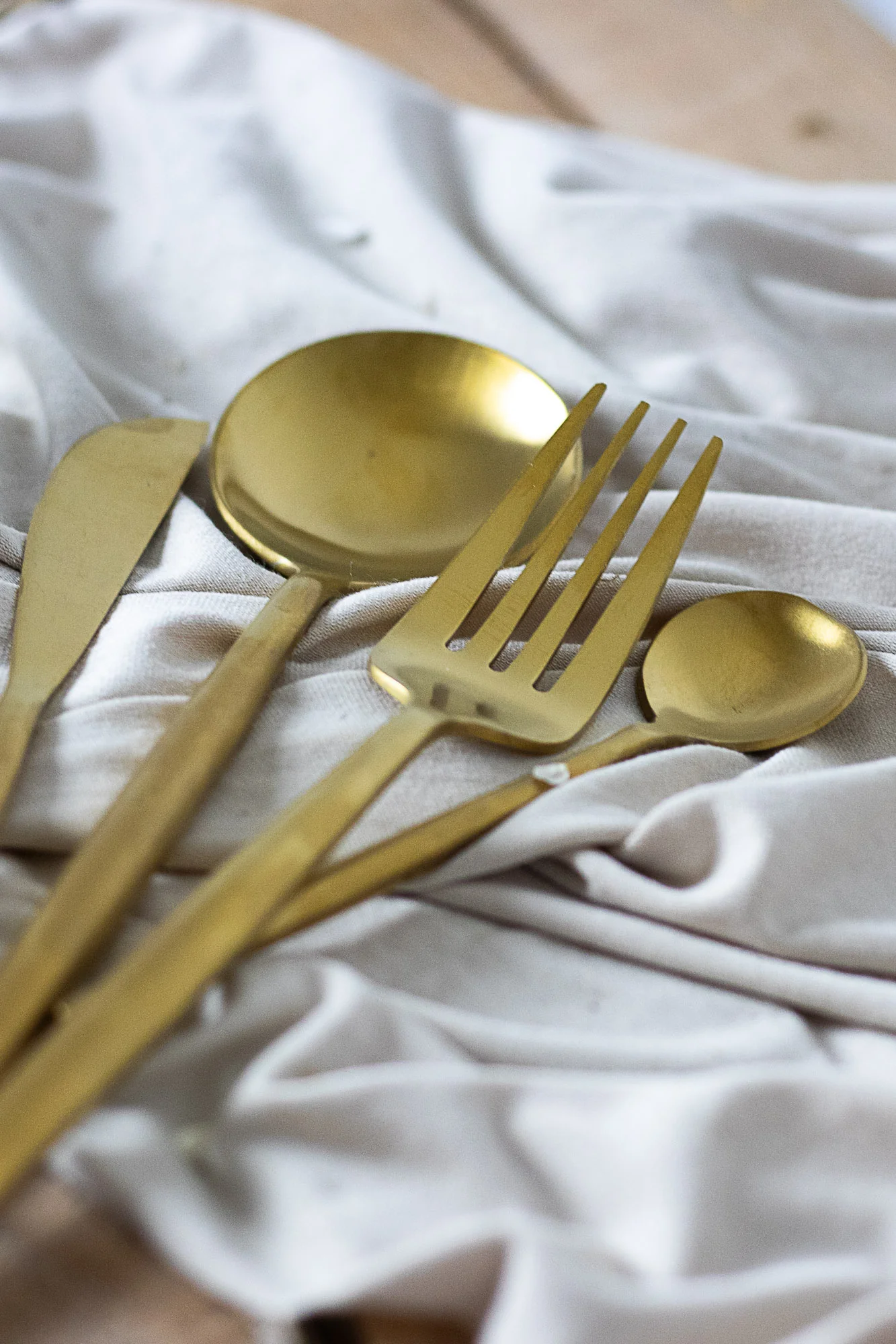 Paulina ist unser stilvolles 4-teiliges Besteck-Set aus goldfarbenem Edelstahl – bestehend aus Speisemesser, Speisegabel, Speiselöffel und Dessertlöffel. Das moderne, minimalistische Design macht es zu einem echten Hingucker auf jeder festlich gedeckten Tafel. Hinweis: Darf nicht in einer Spühlmaschine gereinigt werden!
