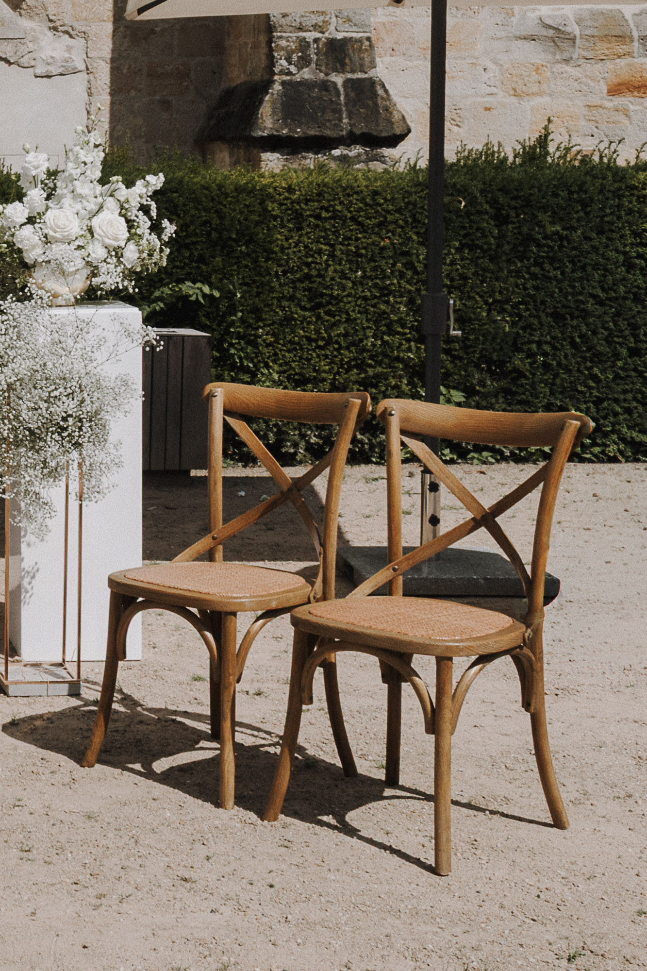 Die Crossback-Stühle Cross fügen sich harmonisch in jedes Trausetting ein – und verleihen ihm eine zeitlose, elegante Note.